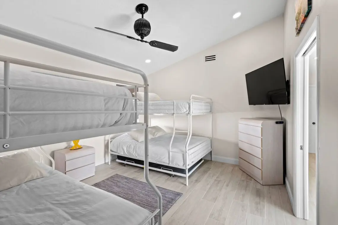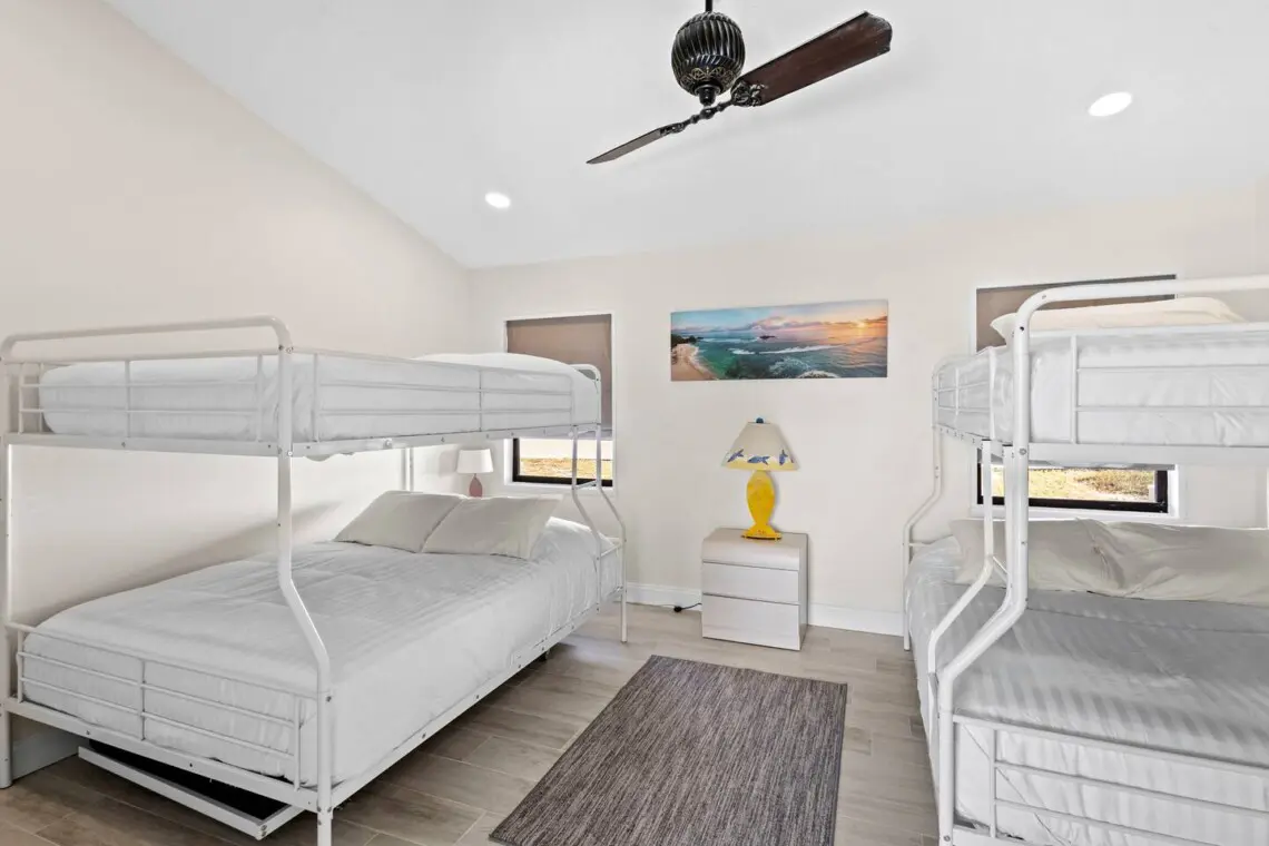 Two full-over-queen bunk beds with twin trundles – perfect for kids or groups