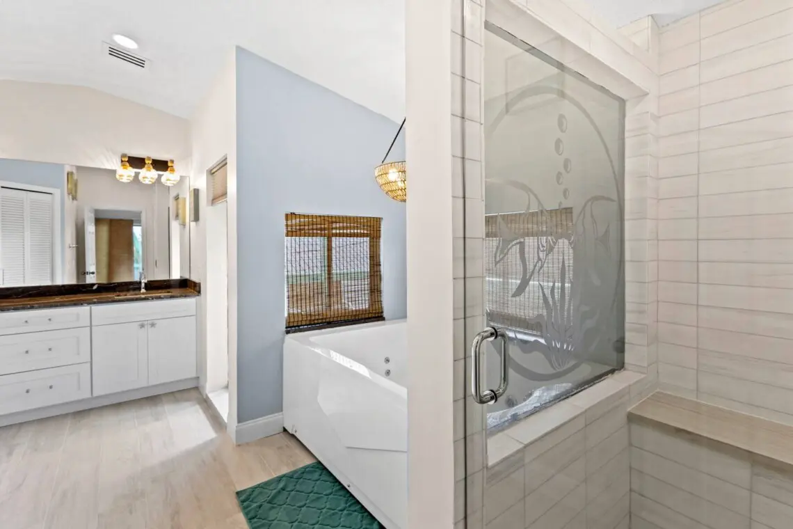 Private ensuite bathroom with a jetted tub and walk-in shower