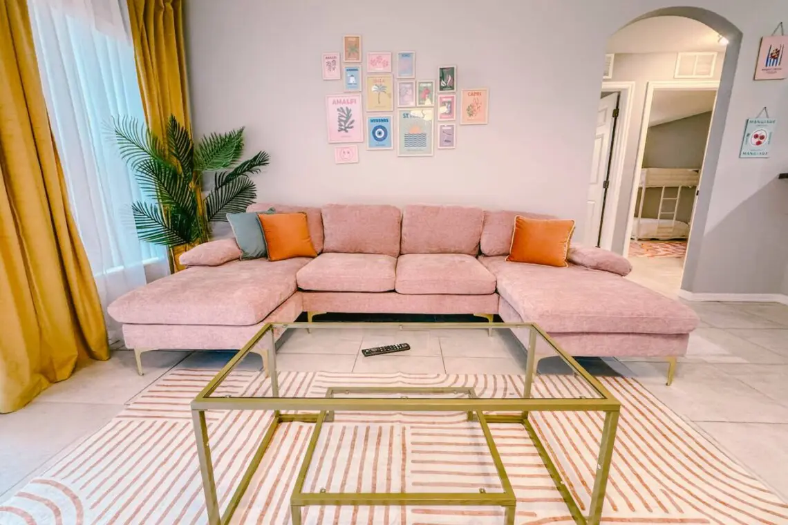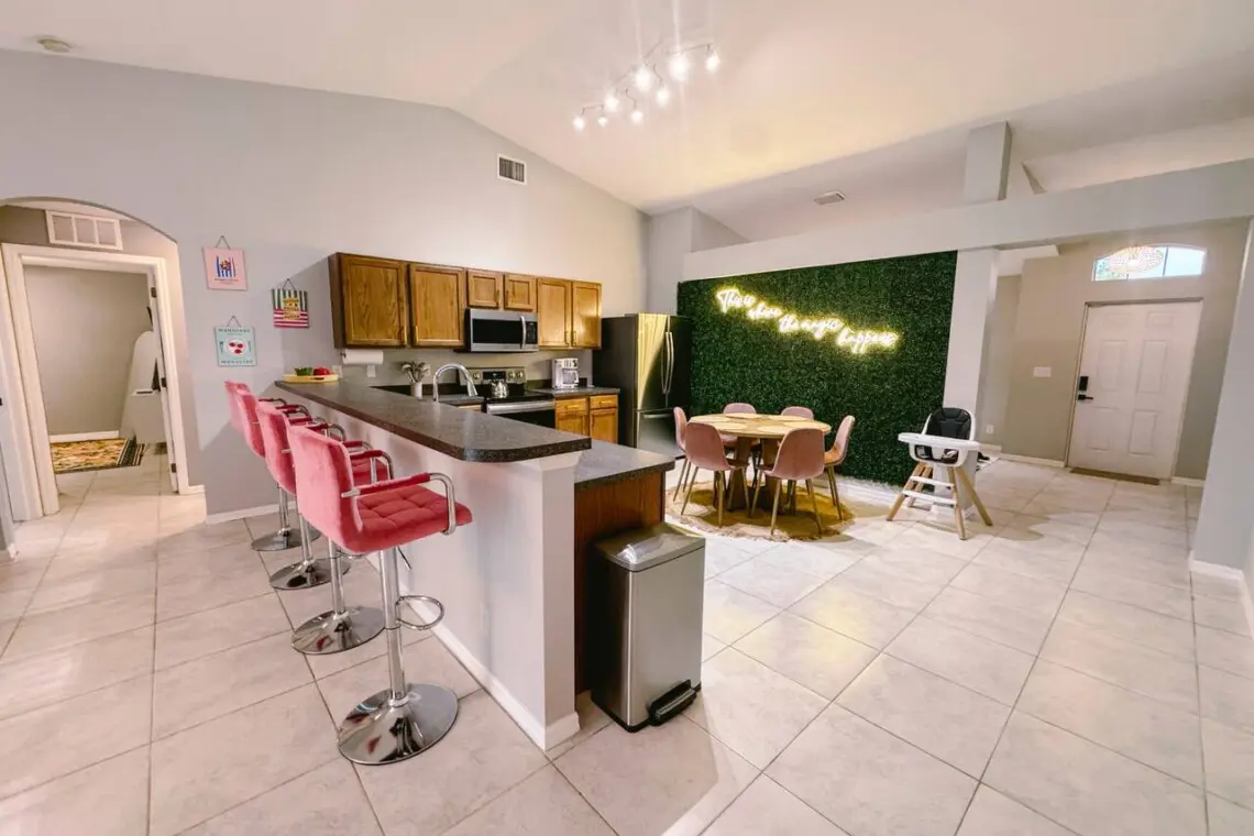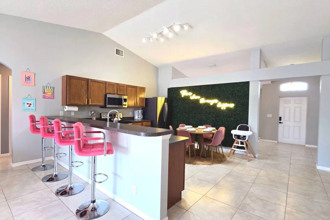 Designed with a split floor plan, the layout offers added privacy—perfect for multiple families or groups traveling together. The open living space is bright, inviting, and thoughtfully designed with modern touches and chic finishes. The fully stocked kitchen includes bar seating and a dining area where everyone can gather for meals or game nights.