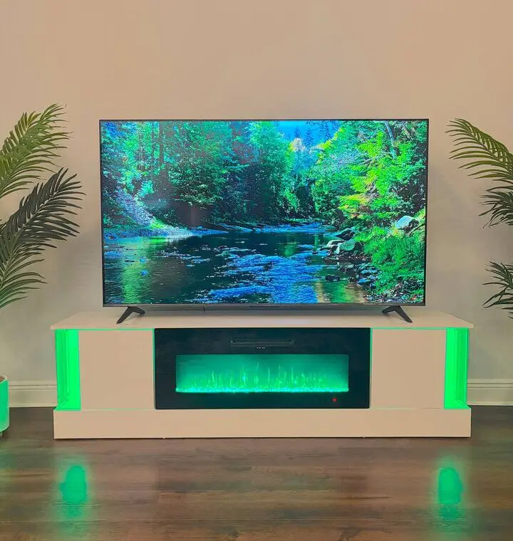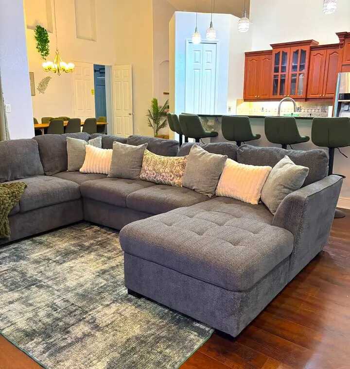 Living Room: Huge sectional, smart TV & electric fireplace