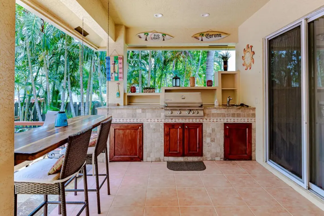 Outdoor kitchen with BBQ grill & sink for poolside feasts