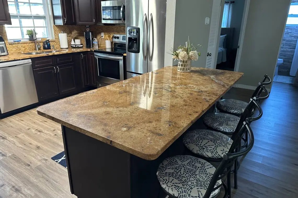 The expansive granite countertop offers plenty of room for both food preparation and dining, complete with four comfortable stools for a welcoming and versatile dining experience. Additionally, you can enjoy meals alfresco at the outdoor covered dining table, perfect for savoring the fresh air while you dine.