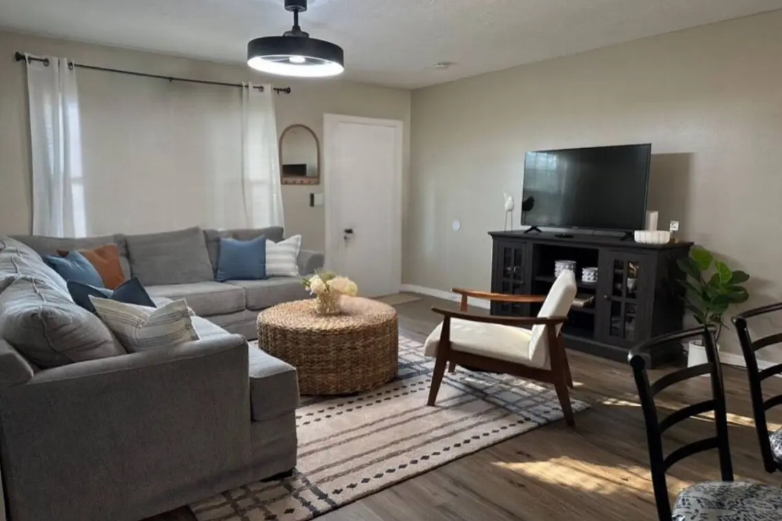 Relax on the oversized, comfy couch in the sitting area and take in the beauty of the majestic oak tree in the front yard. Whether you’re chatting with family and friends or enjoying your favorite shows on the smart TV, which offers a wide range of cable channels and streaming platforms, there’s something for everyone. If TV isn’t your thing, dive into a variety of board and card games for endless fun and entertainment!