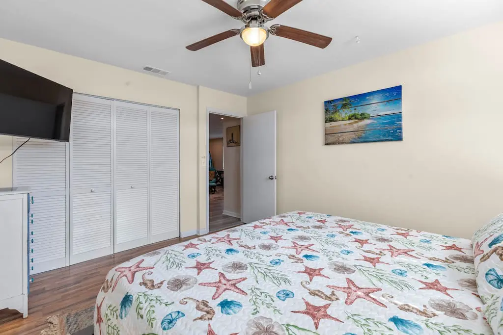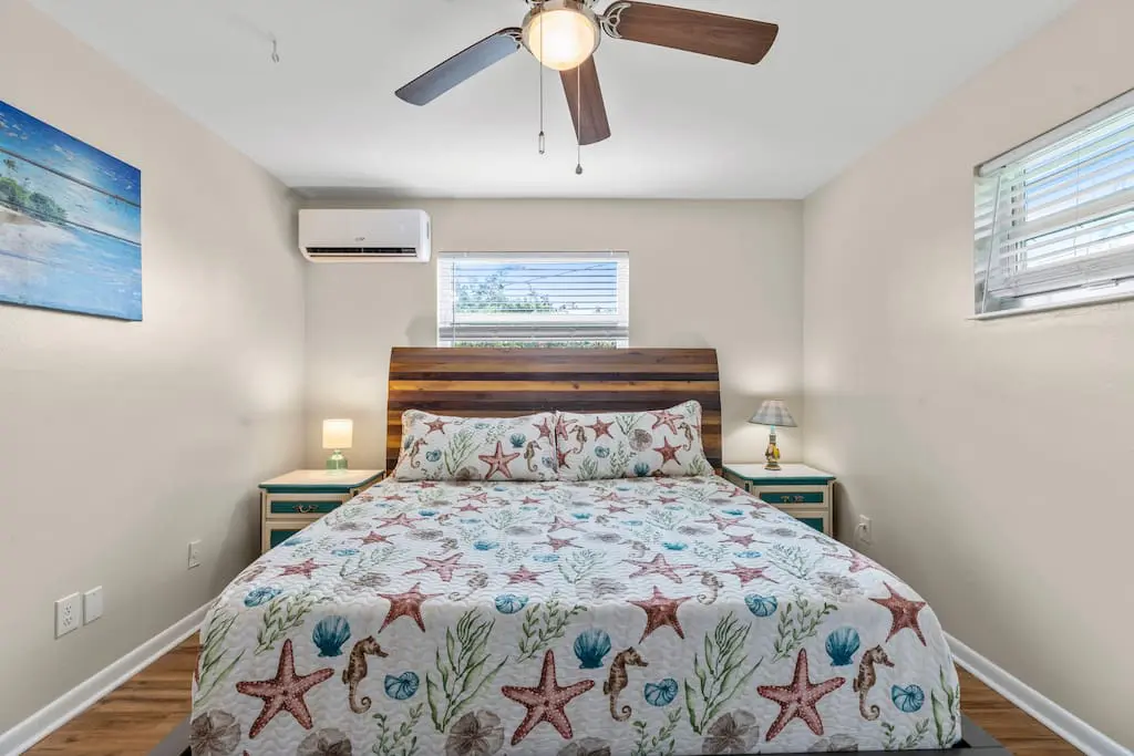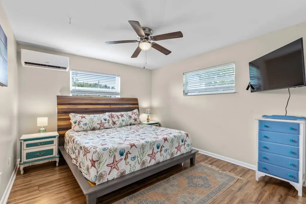 Master Bedroom: A luxurious king-size bed, complete with plush linens, perfect for unwinding after a day at the beach or exploring the area.