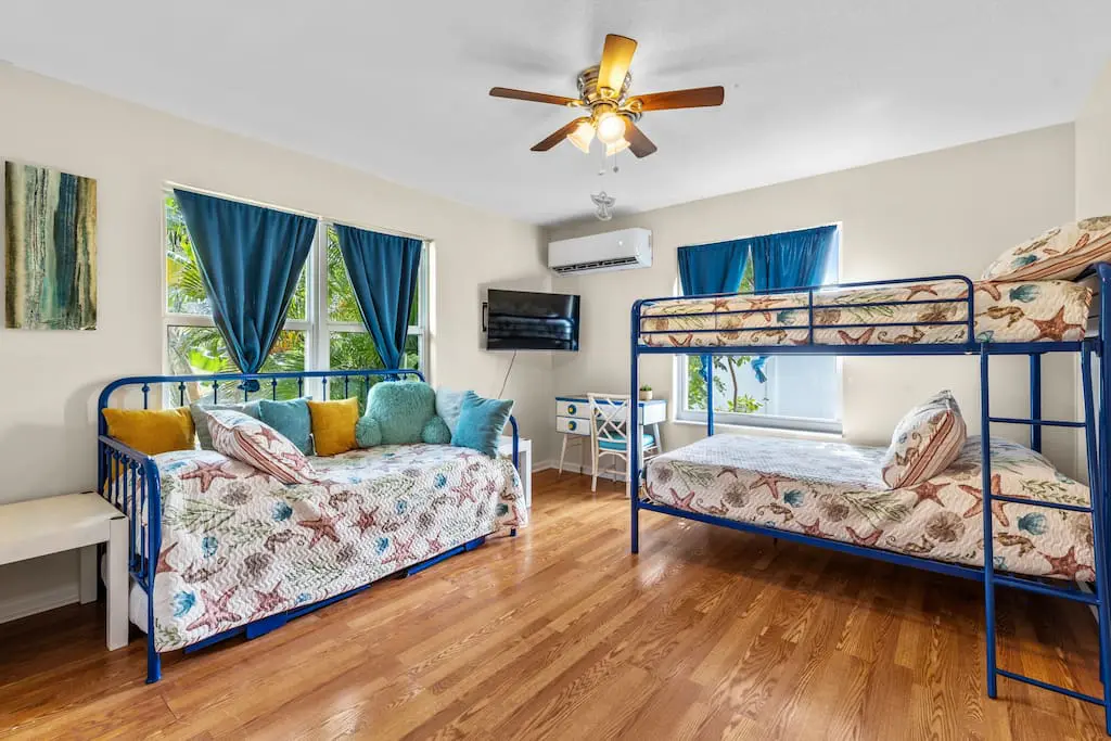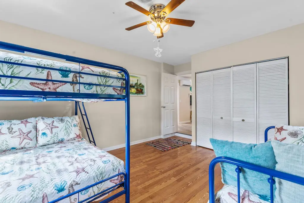 Second Bedroom: A versatile space featuring a full-over-full bunk bed and a daybed with a trundle, ideal for kids or extra guests.