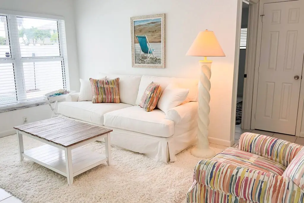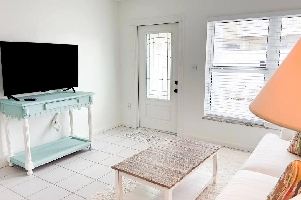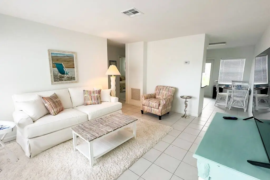 Discover a coastal retreat in this beautifully updated apartment, exuding a relaxing beach vibe and modern comfort. Unwind in the inviting living space, perfect for lounging after a sun-soaked day. Lounge on the plush sofa, catch up on your favorite shows on the expansive flat-screen TV, or revel in the natural light streaming through the windows.
