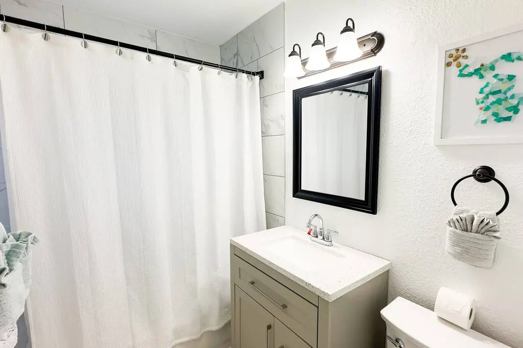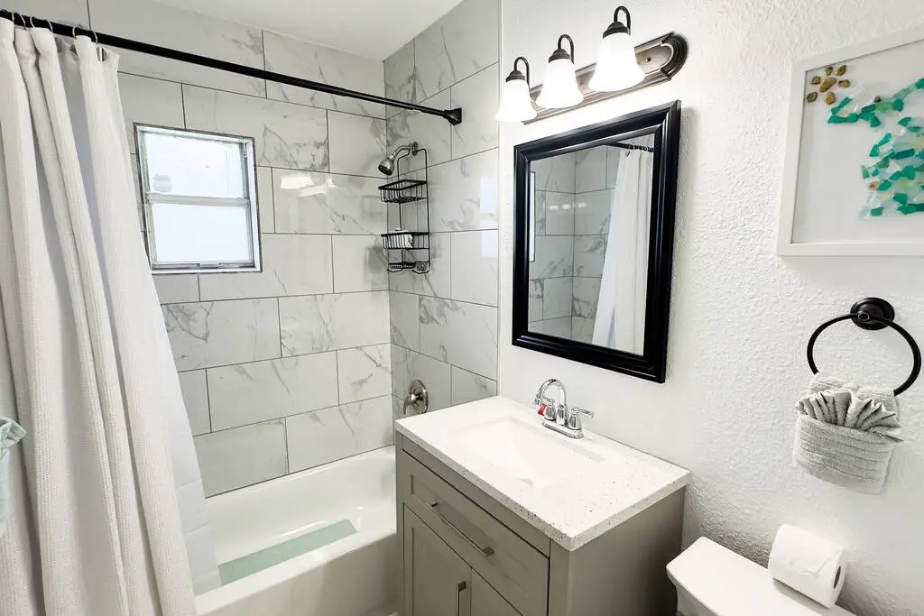 The contemporary bathroom offers a rejuvenating experience, featuring a shower and tub combo to start your day fresh or unwind in the evening.