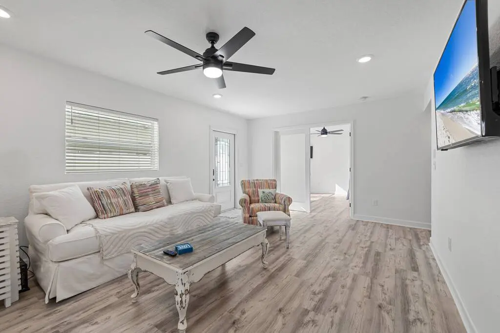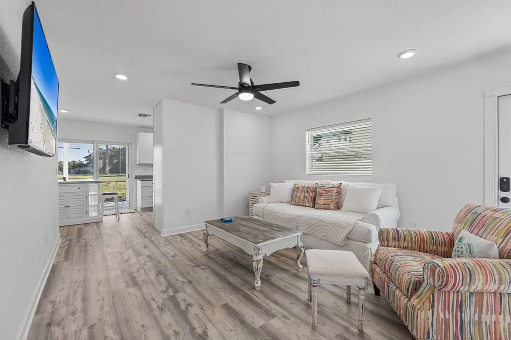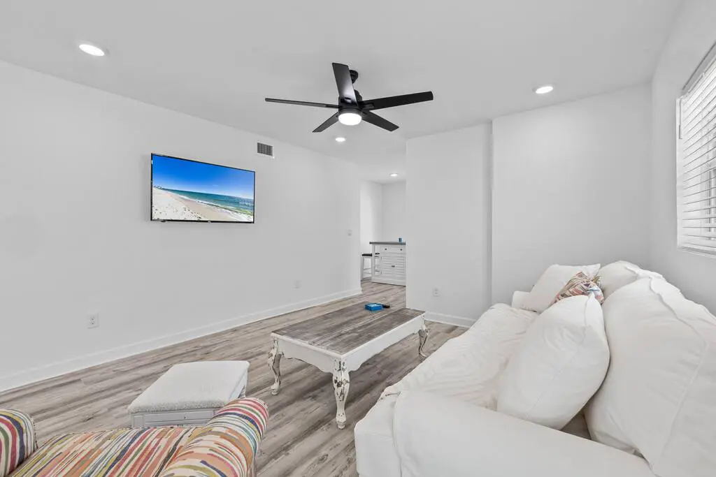 Discover a coastal retreat in this beautifully updated apartment, exuding a relaxing beach vibe and modern comfort. Unwind in the inviting living space, perfect for lounging after a sun-soaked day. Lounge on the plush sofa, catch up on your favorite shows on the expansive flat-screen TV, or revel in the natural light streaming through the windows.